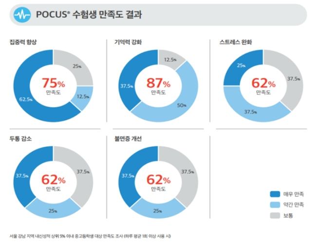 포커스 학생 체험단 조사에서 하루 평균 1회 이상 사용한 학생들은 집중력 향상 외에도 △기억력 강화(87.5%) △스트레스 완화(62%) △두통 감소(62%) △불면증 개선(62%) 효과를 얻었다고 답했다.